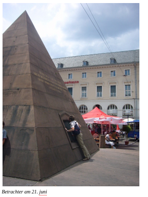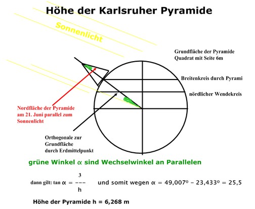 Angeblich treffen genau einmal jedes Jahr, am 21. Juni, die Strahlen der Sonne auf die Nordseite der Pyramide. Daraus kann man die Höhe der Pyramide berechnen.