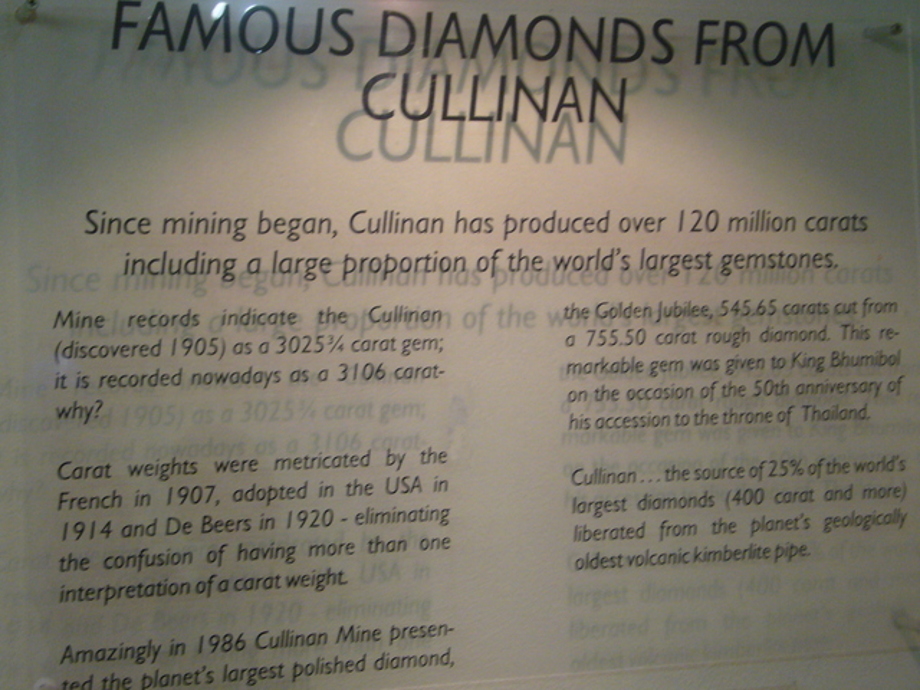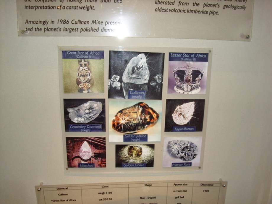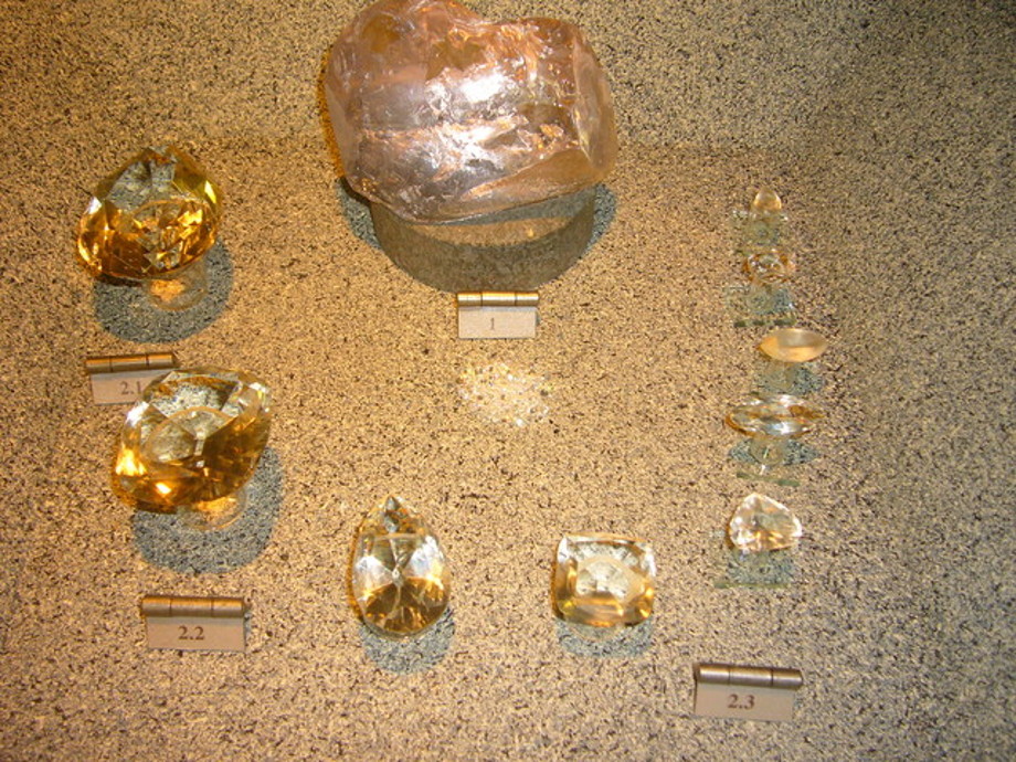 Dieser weltgrößte Rohdiamant wurde King Edward VII vom Vereinigten Königreich zu seinem 66sten Geburtstag geschenkt. Aus dem Rohdiamanten wurde insgesamt 7 Edeldiamanten geschnitten, die die Namen Cullinan I bis Cullinan VII erhielten. Der Cullinan I erhielt den Namen "Great Star of Africa" (530 Karat). Er war auch der größte geschliffene, farbenreichste Diamant der jemals hergestellt wurde, bis 1985 der "Golden Jubilee Diamond" (545 Karat) ebenfalls in der Cullinan Mine gefunden wurde. Der Cullinan I ziert heute das königliche Zepter (siehe vorletztes Bild). Der Cullinan II (317 Karat) wurde in die königliche Krone montiert.