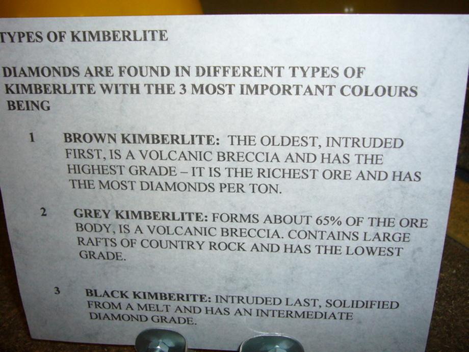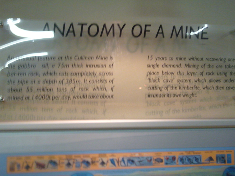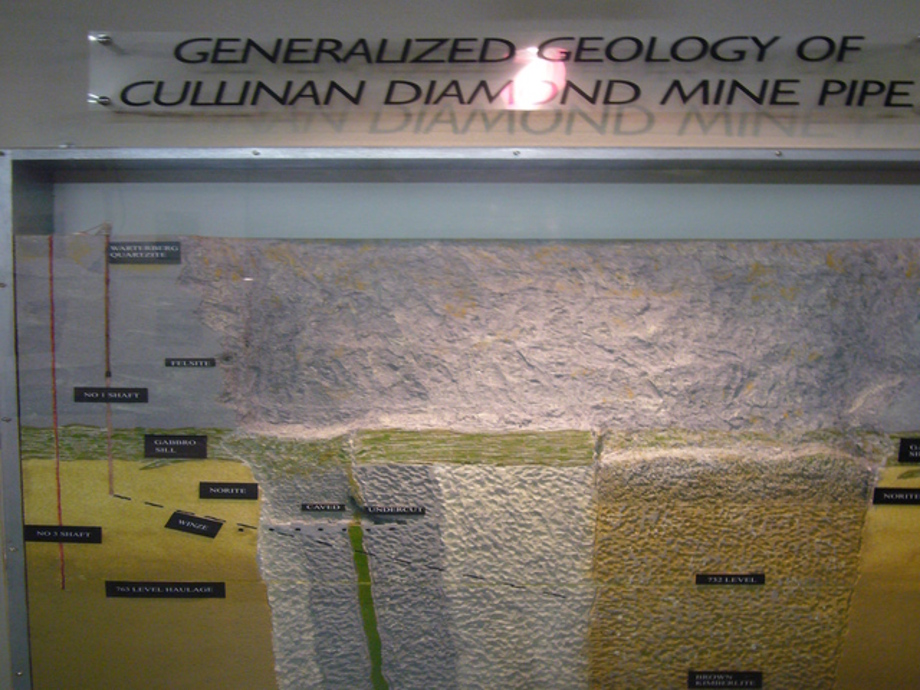 Sie ist ein Vulkanschlot mit einer Oberfläche von 32 Hektar. Das große Loch siehe Bilder 11 und 12. Die Mine wurde 1902 gegründet, als dort die ersten Diamanten gefunden wurden. Angeblich von einem Hirten, der dort Tiere gehütet hatte. 1905 wurde der größte jemals gefunde Rohdiamant von 3106,75 Karat (621.350 g) entdeckt.